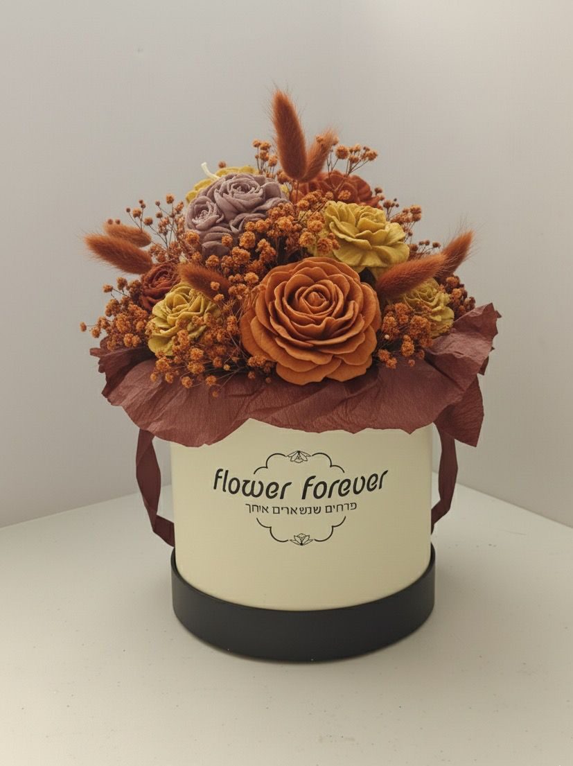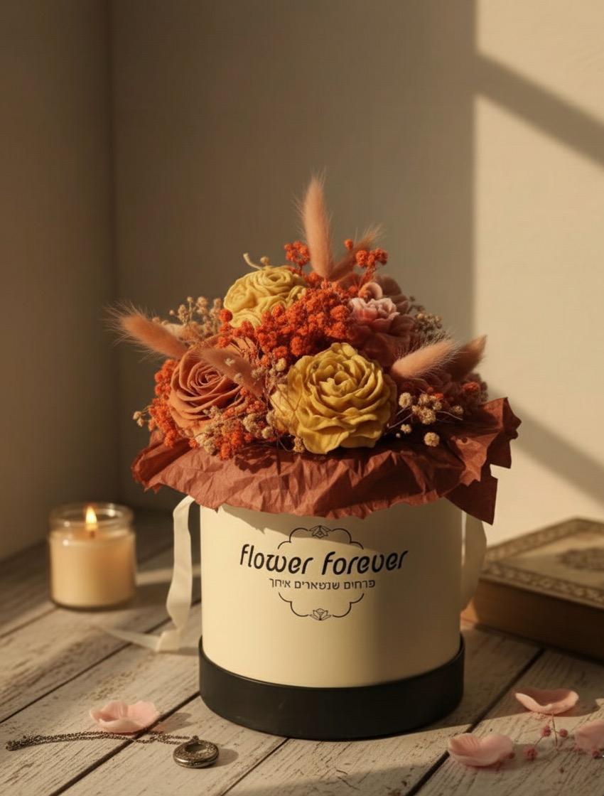 יופי נצחי: בניגוד לזר פרחים טרי, סידור זה נשמר לאורך זמן רב, ומאפשר לכם ליהנות מהעיצוב המרהיב ללא צורך בתחזוקה.