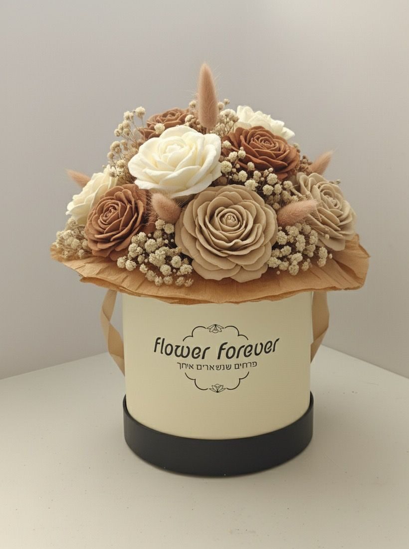 יופי נצחי: בניגוד לזר פרחים טרי, סידור זה נשמר לאורך זמן רב, ומאפשר לכם ליהנות מהעיצוב המרהיב ללא צורך בתחזוקה.