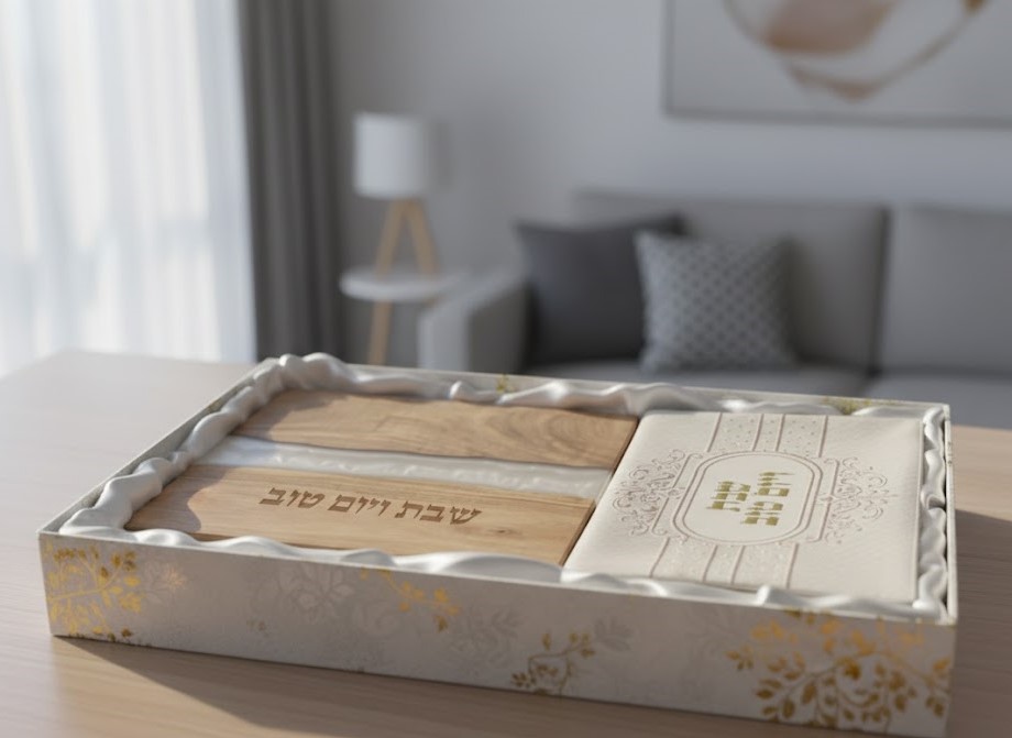 מארז שבת מושלם המשלב קרש חיתוך עץ ושיש/אפוקסי יוקרתי עם כיסוי חלה מהודר,