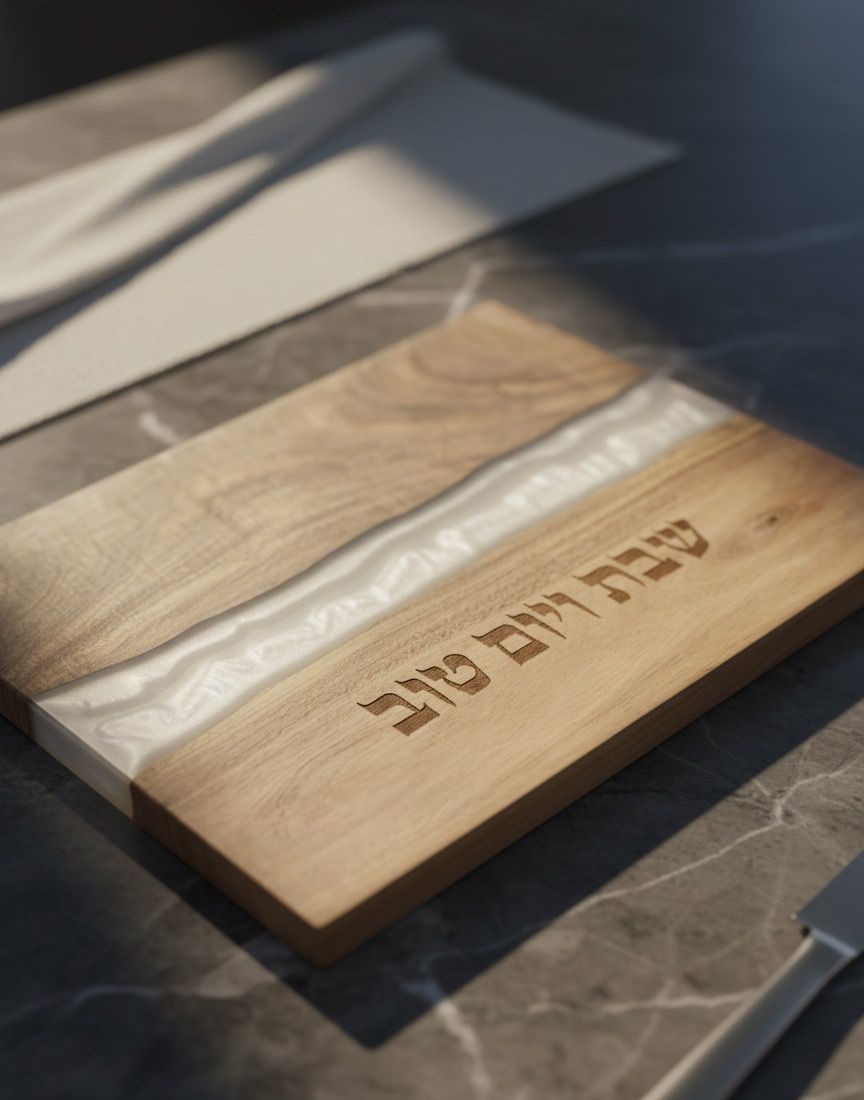 הכיתוב: חרוט בלייזר בכיתוב "שבת ויום טוב" בגופן מהודר.