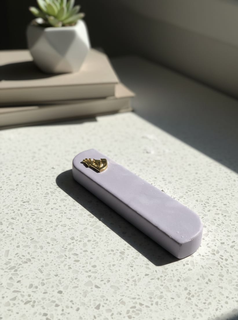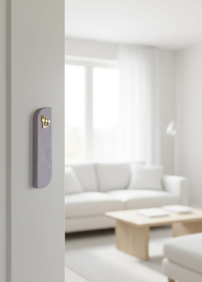 בית מזוזה מינימליסטי עשוי יציקה מינרלית בגימור קטיפתי, הנעשה בעבודת יד אצלנו בסטודיו.