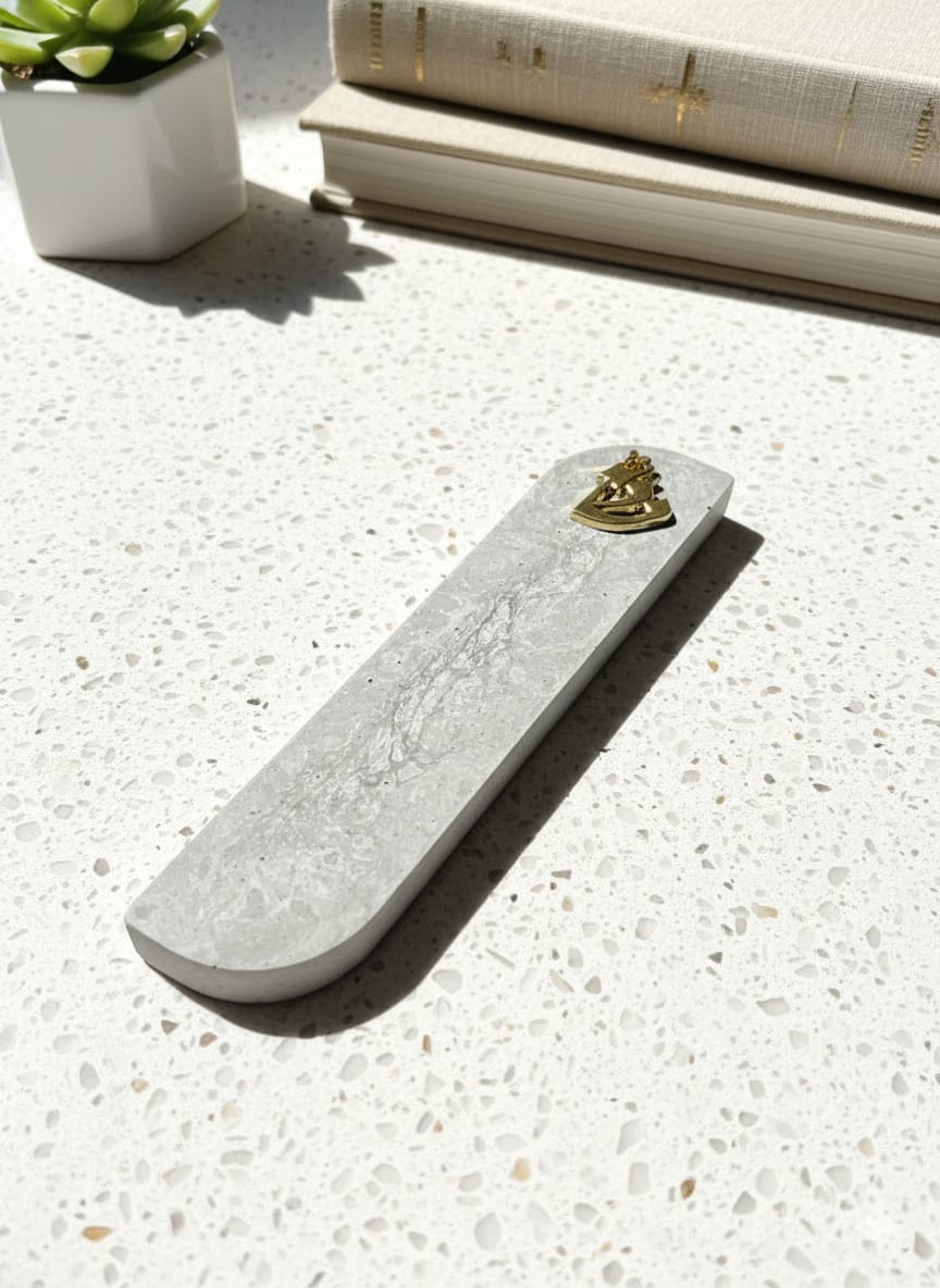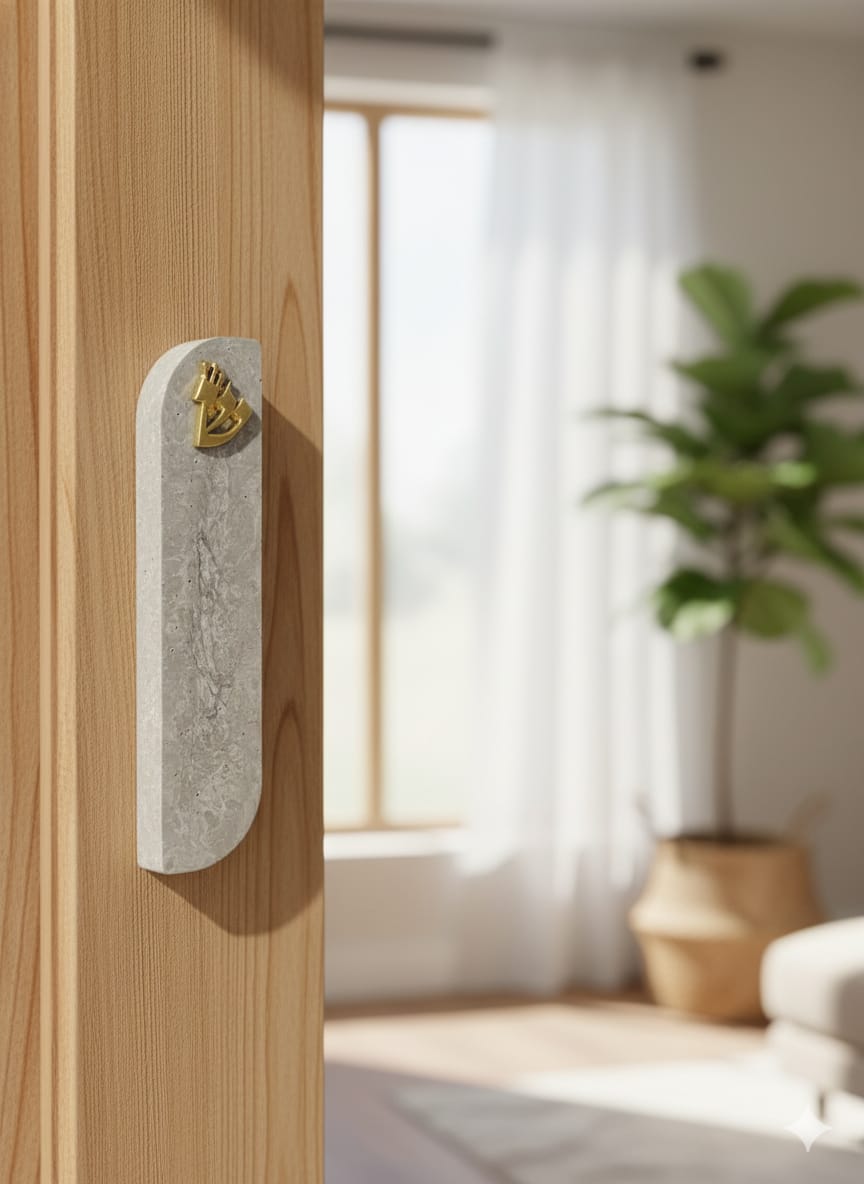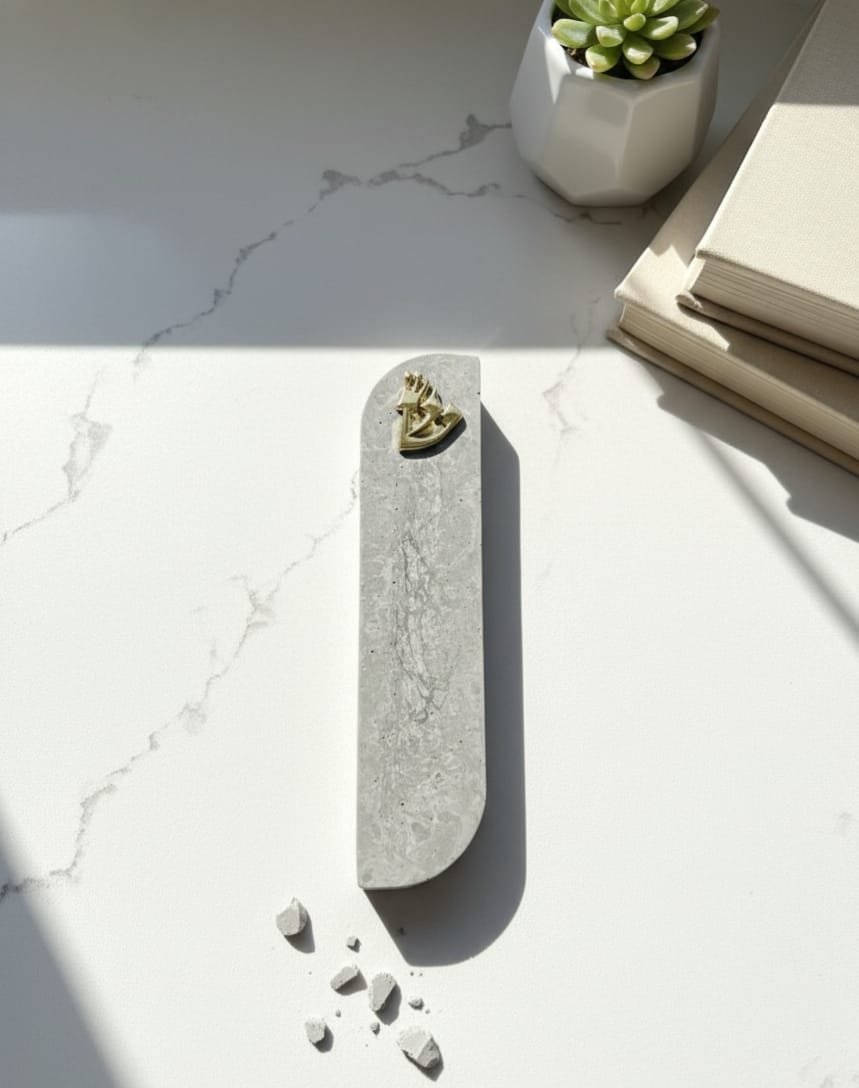 בית מזוזה מינימליסטי בגווני אפור עדין עשוי יציקה מינרלית בגימור קטיפתי, הנעשה בעבודת יד אצלנו בסטודיו.
