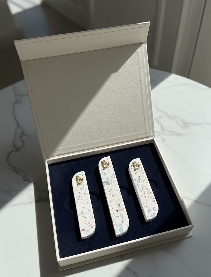 הכניסו טקסטורה, צבע ועיצוב מתוחכם לפתחי הבית עם סט בתי המזוזה "טֶרָצ'וֹ" – יצירת אומנות מינימליסטית בעבודת יד.