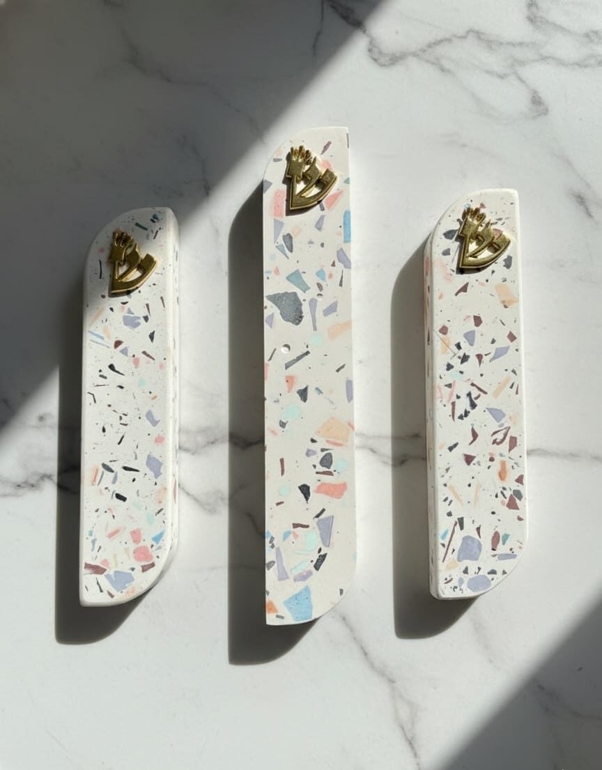 חומר ומרקם: בתי המזוזה נוצקו מחומר איכותי ועמיד בגימור מט, כאשר שבבי הטרצ'ו הצבעוניים משובצים בעומק החומר, ויוצרים עומק וטקסטורה עשירה.