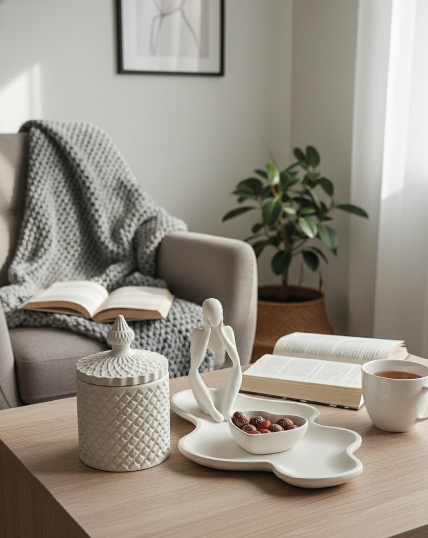 כלי אחסון מפואר עם מכסה בסגנון אוריינטלי, פסלון האישה החושבת אלמנט פיסולי מודרני, המעודד רגע של שקט והרהור